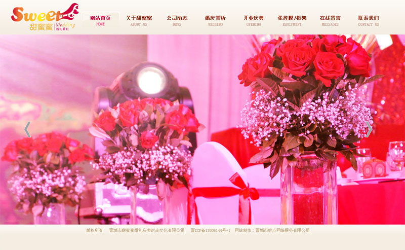 晋城市甜蜜蜜婚庆礼仪服务部简称“甜蜜蜜婚礼庆典”,公司成立于公元二零零九年三月,烟花烂漫,爱情盛放的季节光彩耀市。自开业时至今日甜蜜蜜以优良的职业操守,专业的服务品质,坚实的市场根基,博得社会各界人士的一致好评。