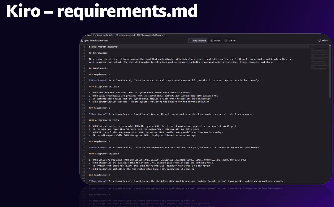 • 生成规范:Kiro会与开发者来回对话,将模糊的想法扩展为一份详细的、包含验收标准(Acceptance Criteria)的技术规范。