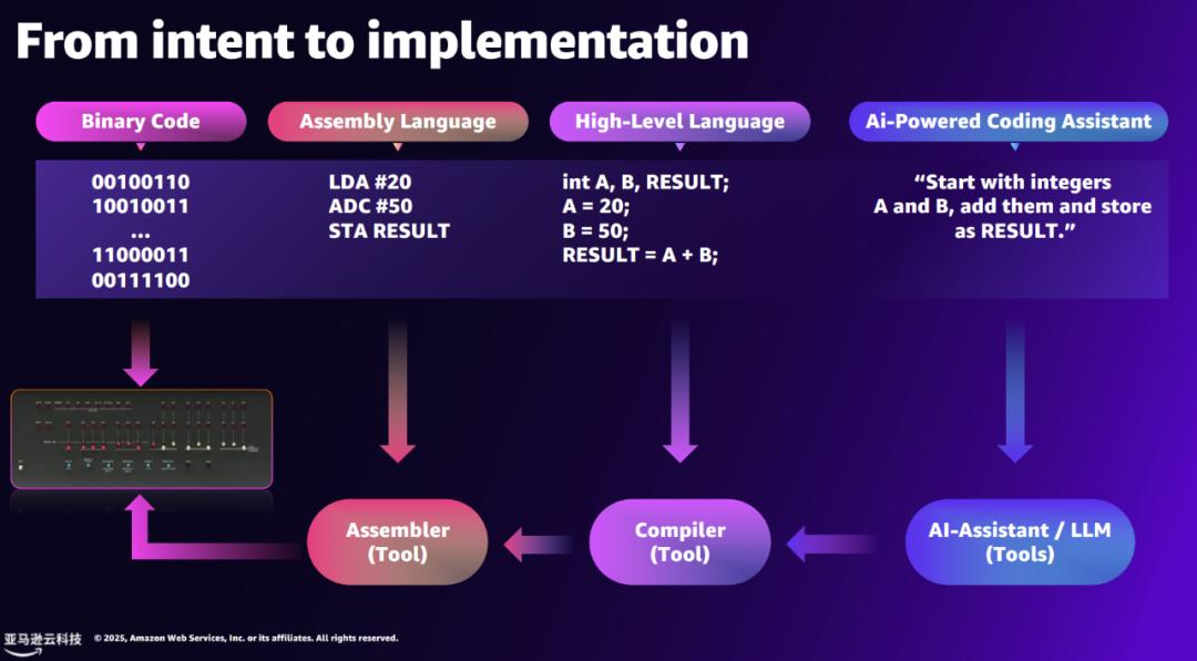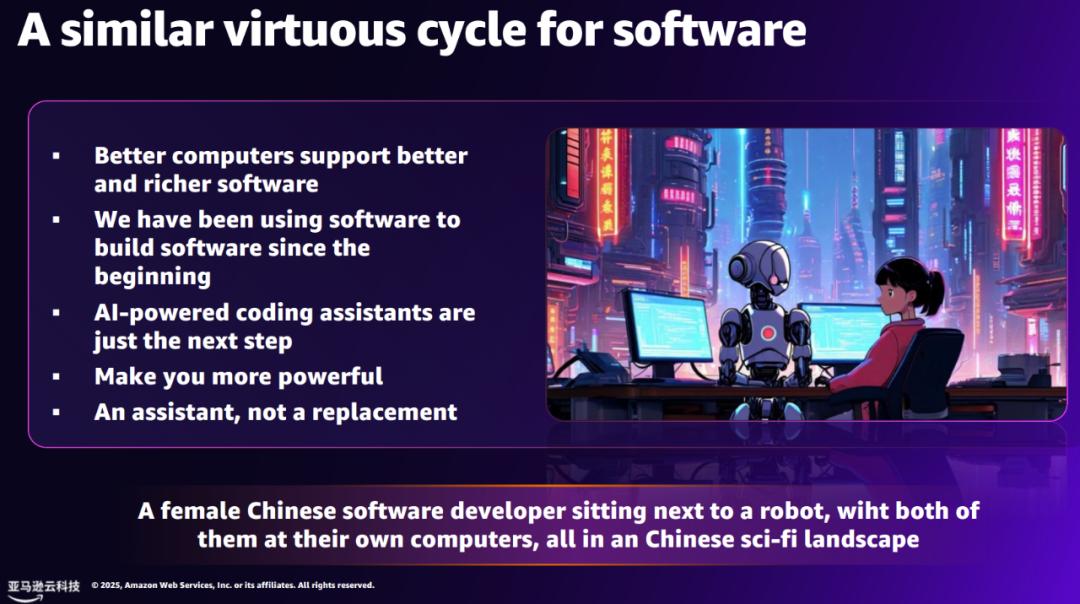 Jeff Barr在主题为「下一代软件开发」的演讲中强调:「AI驱动的开发工具,并非什么彻底的革命,而是我们开发工具演进中合乎逻辑的下一步(logical next step)。」