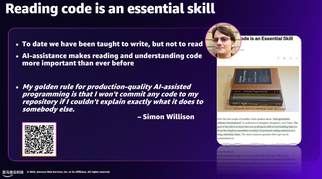 「在这个过程中,开发者仍然是掌控者,」Jeff Barr强调,「AI是你的助手,而不是你的替代者。它在放大你的技能,而不是取代它们。」