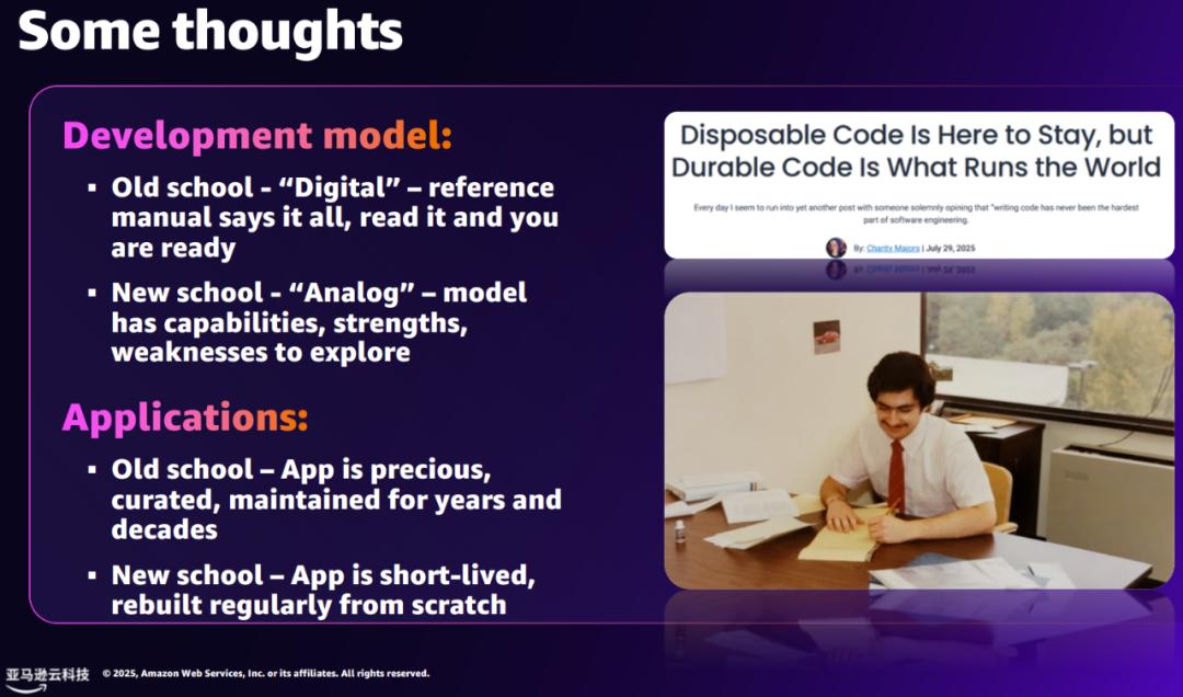 「未来,可能会有某些应用,我们将其视为即用即抛的。」Jeff Barr预测道,「我们会构建它、使用它,但不再考虑长期维护。当需求变更时,我们只需回到规范层面进行修改,然后让AI重新生成一个全新的、更好的版本。」